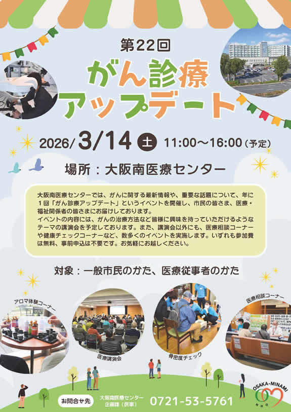 大阪南医療センターでは、がんに関する最新情報や、重要な話題について、年に1回「がん診療アップデート」というイベントを開催し、住民の皆さま、医療・福祉関係者の皆さまにお届けしております。